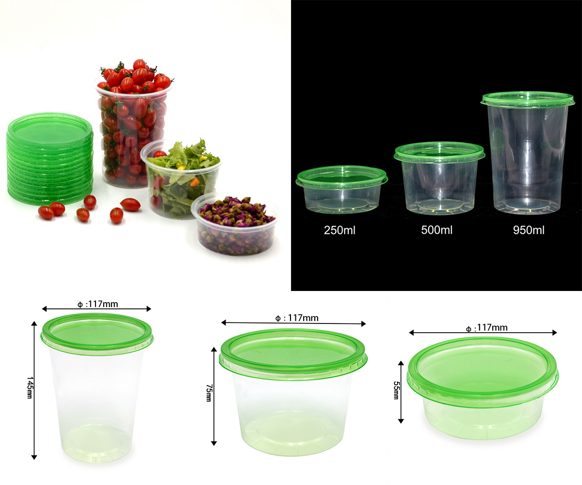 البعد | 250 مل: القطر: 117 ملم الارتفاع: 55 ملم 500 مل: القطر: 117 ملم الارتفاع: 75 ملم 950 مل: القطر: 117 ملم الارتفاع: 145 ملم الغطاء: القطر: 117 ملم الارتفاع: 5 ملم |