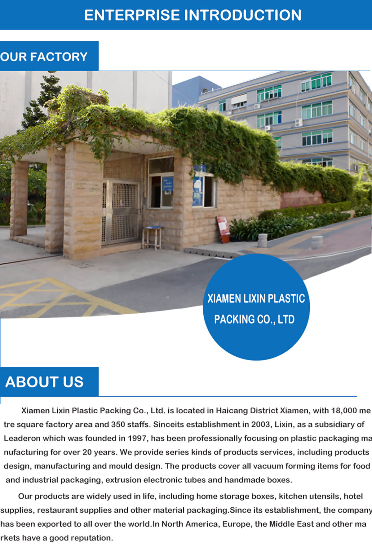 كشركة رائدة في مجال التغليف البلاستيكي Xiamen Lixin Plastic Packing Co., Ltd.تلتزم بتزويد العملاء بحلول تغليف عالية الجودة ومبتكرة.يتم استخدام منتجاتنا على نطاق واسع في تغليف المواد الغذائية والتعبئة الإلكترونية والتعبئة الصناعية والعديد من المجالات الأخرى