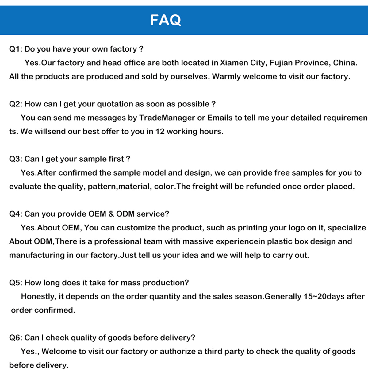 لتلبية المعايير العالمية للإدارة ومراقبة الجودة، علينا أن نواصل تحسين أنفسنا.منذ عام 2006، حصلنا على شهادات ISO9001، ISO14001 وBRCGS.تباع بشكل جيد في جميع المدن والمقاطعات في جميع أنحاء الصين، ويتم تصدير منتجاتنا أيضًا إلى العملاء في بلدان ومناطق مثل الشرق أ
