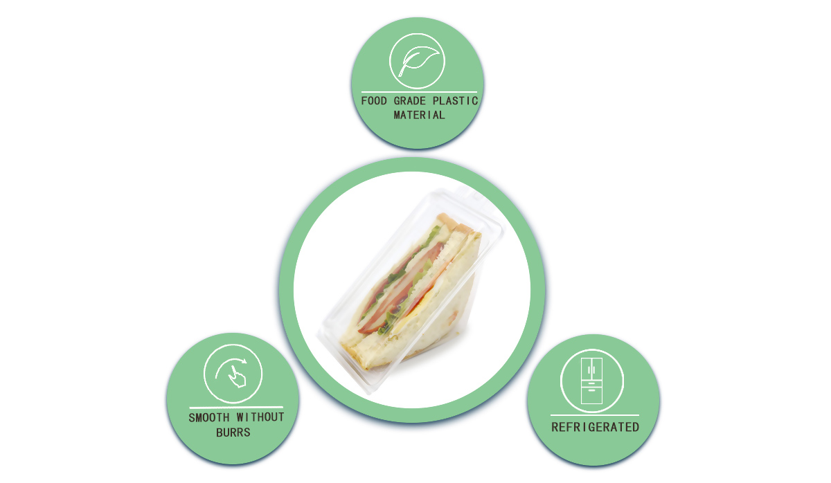 يظهر هنا نمط واحد من سلسلة علبة صدفي ساندويتش بلاستيكية يمكن التخلص منها.مع تصميم على شكل مثلث، هذا الصندوق يعد خيارًا جيدًا لتعبئة الوجبات الجاهزة للمخبوزات، خاصة للساندويتش أو أي نوع آخر من الخبز المشابه.